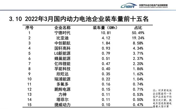2022年1-3月國內(nèi)動力電池企業(yè)裝車量前十名分別是:寧德時代、比亞迪、中創(chuàng)新航、國軒高科、蜂巢能源、LG能源、億緯鋰能、孚能科技、欣旺達、捷威動力。