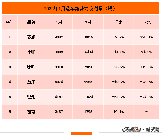 5月1日下午,在我們焦急地等待下,極氪、哪吒、蔚來(lái)、理想、小鵬、零跑陸續(xù)發(fā)布了4月交付量。4月,零跑汽車交付量9,087輛,環(huán)比微降9.7%,超越“蔚小理哪”首奪冠軍,小鵬汽車交付9,002輛,奪得亞軍,哪吒汽車交付8,813輛,獲得季軍。蔚來(lái)汽車交付5,074輛,排名上升一位至第四,理想汽車交付4,174輛,排名嚴(yán)重下滑,從3月第三下降至4月第五。環(huán)比來(lái)看,理想汽車下降最嚴(yán)重達(dá)62.2%,其次是蔚來(lái)汽車下降49%,小鵬下降41.6%,哪吒汽車下降26.7%,零跑汽車微降9.7%。極氪汽車是新勢(shì)力唯一逆勢(shì)增長(zhǎng)的企業(yè),環(huán)比上漲19%。同比來(lái)看,零跑汽車暴漲228%,哪吒汽車大漲近120%,小鵬汽車上漲74.9%,而理想和蔚來(lái)下降超20%。此外,廣汽埃安4月銷量10,212輛,同比增長(zhǎng)23%,1-4月累計(jì)銷量55,086輛,同比增長(zhǎng)113%;合創(chuàng)汽車公布了4月的訂單量,3,084輛,同比增長(zhǎng)6500%,環(huán)比增長(zhǎng)2.3%,未公布交付量。